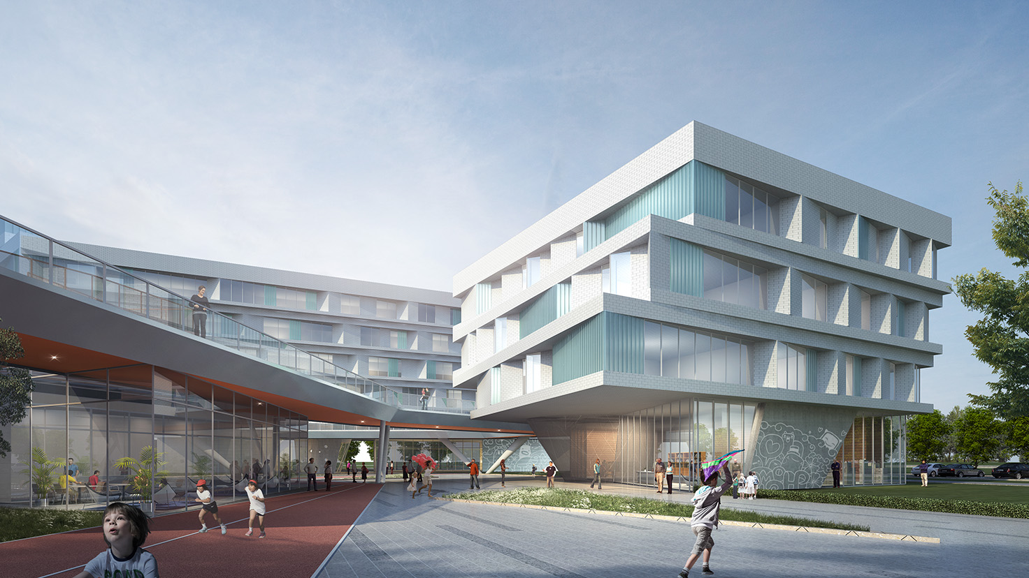 設(shè)計(jì)背景:提出城市公園的概念,在場地的西南側(cè)、靠近瀏陽河風(fēng)光帶以及濕地公園,利用架空平臺(tái)可以更好地欣賞到沿河以及公園景觀,引入一條連接濱河路與濕地公園的帶狀活動(dòng)空間,打破原本封閉的體量。 采用分散式布局,利用多層次的室外平臺(tái)將各個(gè)功能分區(qū)聯(lián)系起來,營造立體公園式的公共交流空間;橢圓形的運(yùn)動(dòng)場館臨濱河路布置,具有較好的標(biāo)志性和引導(dǎo)性;入口前廣場與旁邊福利中心的廣場結(jié)合,促進(jìn)更豐富的城市文化活動(dòng)的展開。
